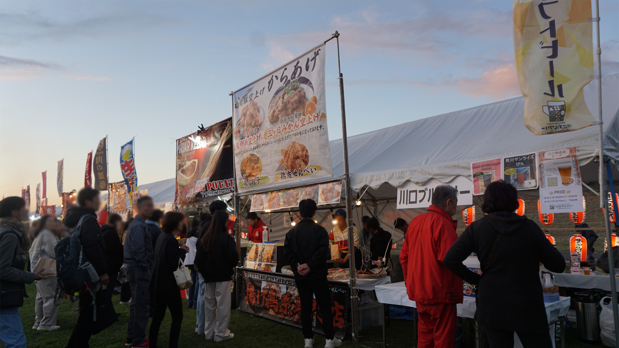 唐揚げ・フライドポテト・フランクフルト・生ビール・飲む冷凍みかん・チョコバナナ・かき氷(当日の気温次第)
