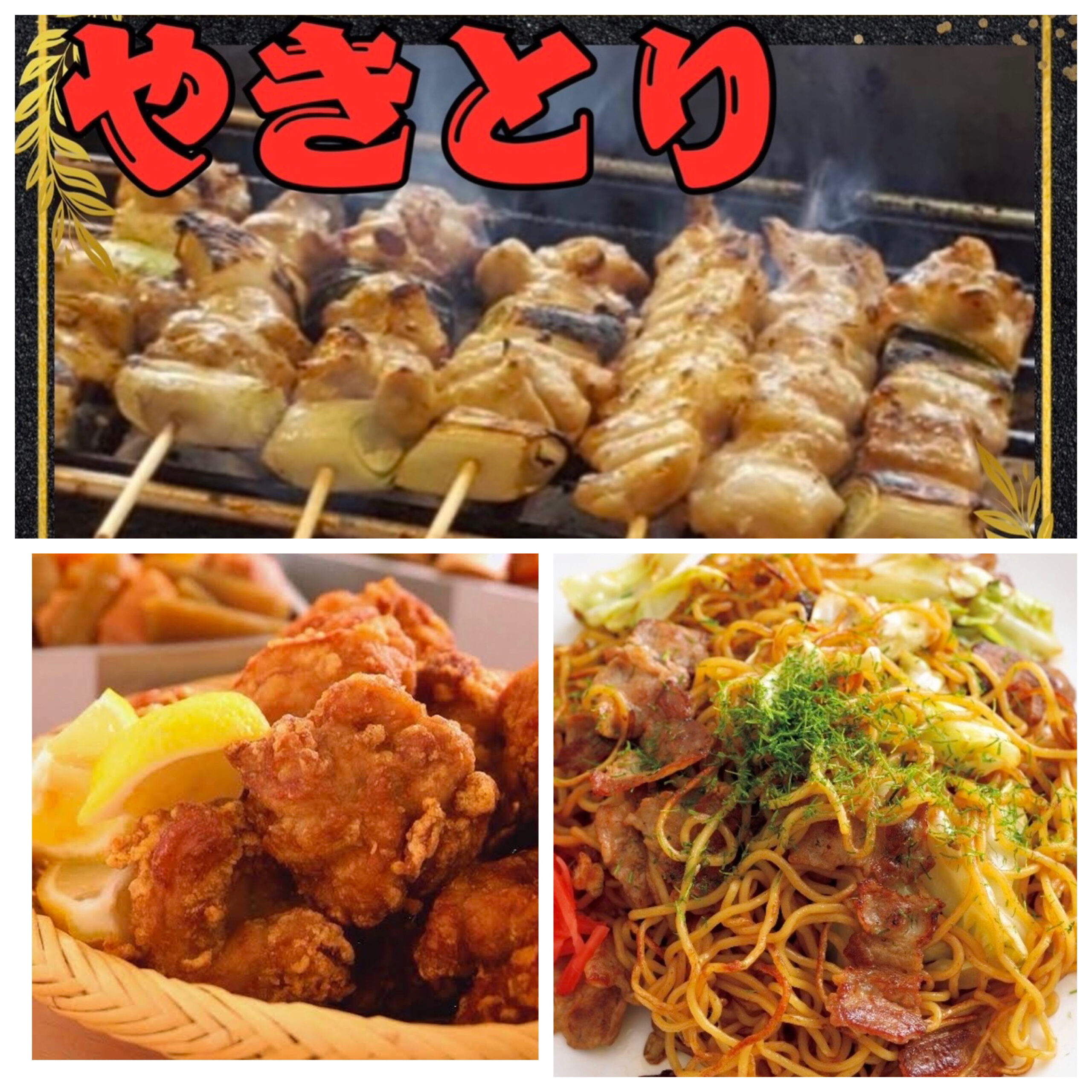 焼き鳥、焼きそば、唐揚げ