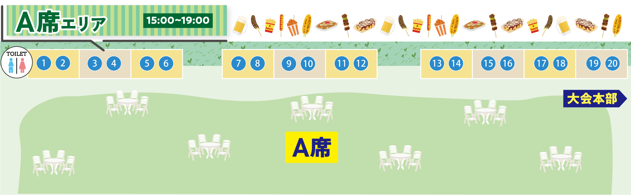有料席(協賛席・A席・B席)の方は席種にかかわらず、場内飲食店を全てご利用いただけます。