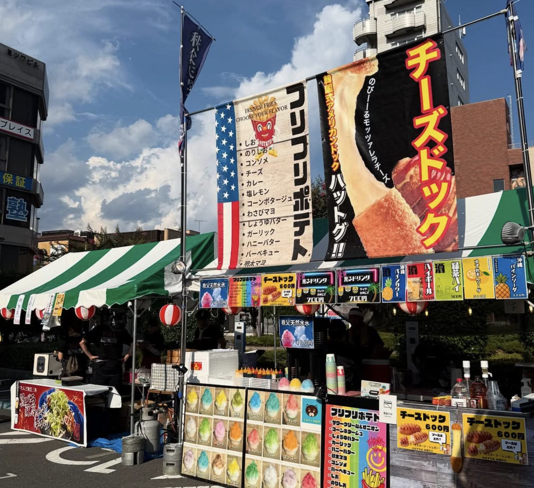 ハラミ串、やきそば、チキン串、ソーセージ串、いか串、かき氷、缶アルコール、ソフトドリンク